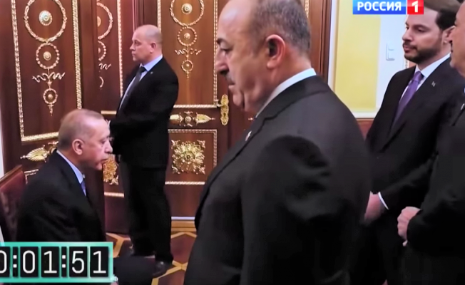 Rusya Devlet Başkanı Vladimir Putin, AKP lideri Cumhurbaşkanı Tayyip Erdoğan’ın Tahran’da yapılan ikili görüşmeye geç gelmesinin ardından kameraların önünde yaklaşık bir dakika tek başına beklemek zorunda kaldı.