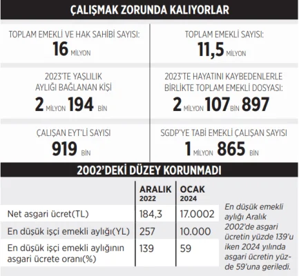 Prof. Dr. Aziz Çelik, 2002'deki düzeyinde kalsaydı emekli maaşının 2024 yılında 23 bin lirayı bulacağını belirtti. Öte yandan SGK verilerine göre, çalışmak zorunda olan 1,8 milyon emekli var.