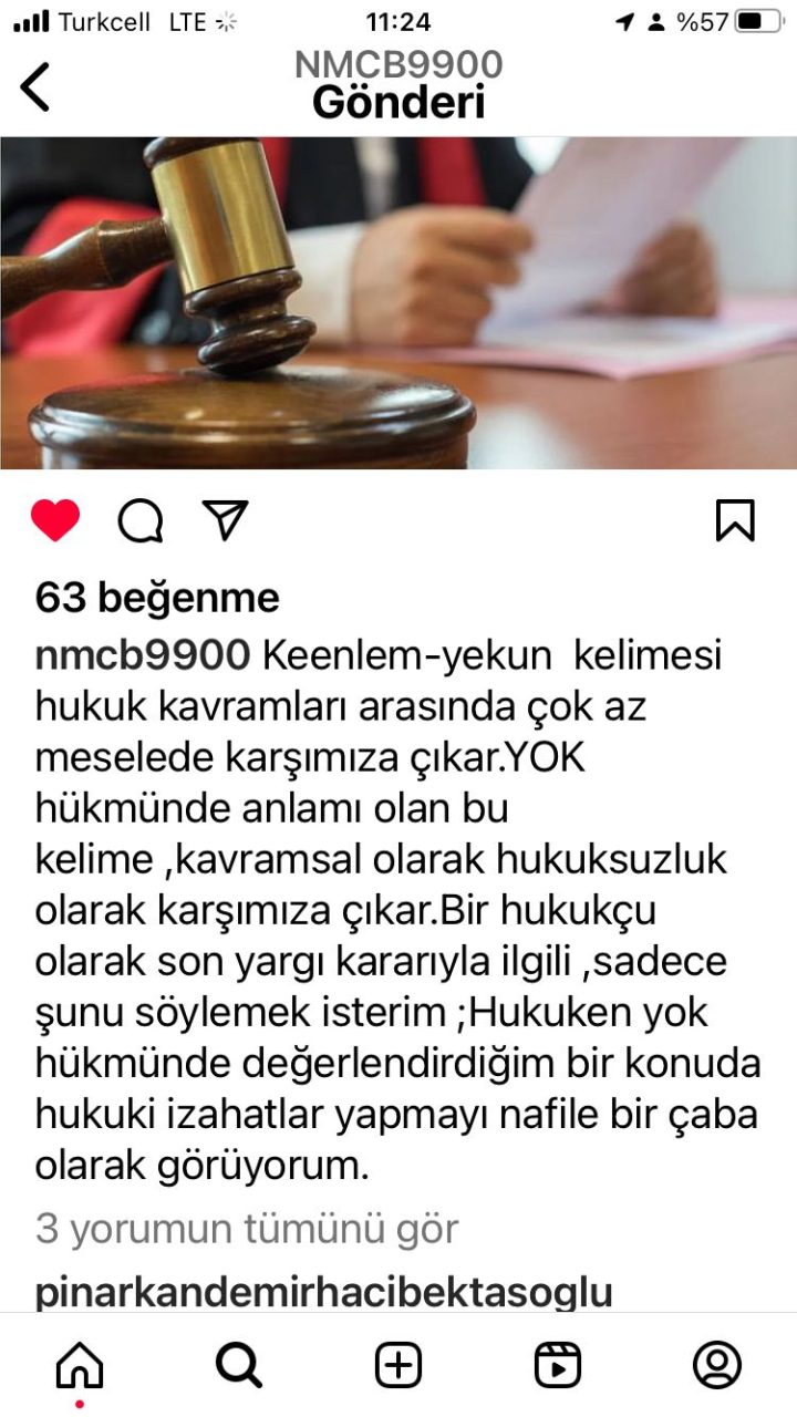 Instagram hesabından açıklama yapan eski AKP'li bakan Nimet Baş, "Keenlem-yekun kelimesi hukuk kavramları arasında çok az meselede karşımıza çıkar. Yok hükmünde anlamı olan bu kelime, kavramsal olarak hukuksuzluk olarak karşımıza çıkar. Bir hukukçu olarak son yargı kararıyla ilgili sadece şunu söylemek isterim hukuken yok hükmünde değerlendirdiğim bir konuda hukuki izahatlar yapmayı nafile bir çaba olarak görüyorum" diye yazdı.
