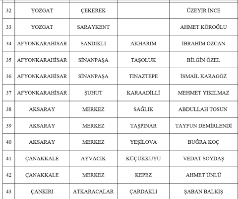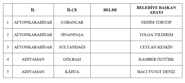 MHP Genel Başkan Yardımcısı Sadir Durmaz'ın yaptığı yazılı açıklamaya göre, partinin yetkili kurullarının değerlendirmeleri ve MHP Genel Başkanı Devlet Bahçeli'nin onayıyla 31 Mart 2024 Mahalli İdareler Genel Seçimlerinde 33 İlçe, 19 Belde adaylarını açıkladı.