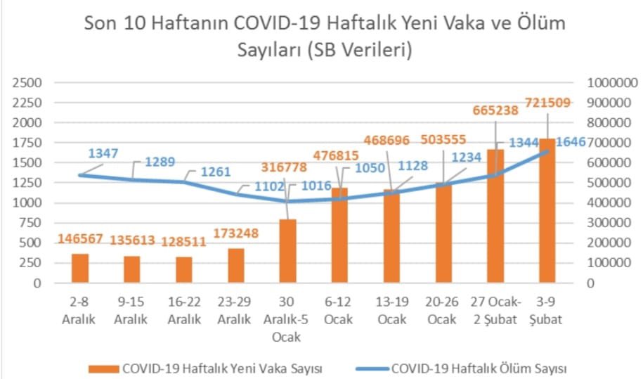 Türk Tabipleri Birliği (TTB), son 10 haftanın vaka ve ölüm sayılarının gösterildiği grafiği sosyal medya hesabından paylaşarak Sağlık Bakanlığını eleştirdi. TTB paylaşımında şu ifadeleri kullandı: