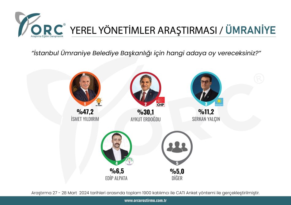 Ümraniye ilçesinde AK Parti adayı İsmet Yıldırım'ın oy oranı yüzde 47,2, CHP adayı Aykut Erdoğdu'nun oy oranı yüzde 30,1, İYİ Parti adayı Serkan Yalçın'ın oy oranı yüzde 11,2, DEM Parti eş başkan adayları Edip Alpata ve Zülfiye Hazar'ın oy oranı yüzde 6,5 olarak ölçüldü.