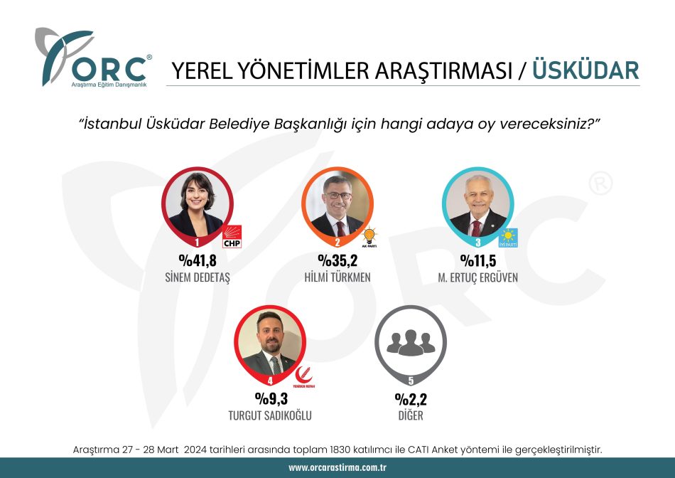 Ankete göre, 2004 yılından beri AK Parti'nin kazandığı Üsküdar Belediye Başkanlığı bu kez CHP kazanıyor. AK Parti'den önce 1994 yılında Refah Partisi, daha sonra partinin kapatılması nedeniyle 1999'da Fazilet Partisi'nden Yılmaz Bayat, Üsküdar Belediye Başkanı seçilmişti. Ankete katılanların yüzde 41,8'i CHP adayı Sinem Dedetaş'ı, yüzde 35,2'si iki dönemdir seçilen AK Parti adayı Hilmi Türkmen'i tercih edeceğini belirtti. İYİ Parti adayı Ertuç Ergüven yüzde 11,5'le üçüncü, Yeniden Refah Partisi adayı Turgut Sadıkoğlu yüzde 9,3'le dördüncü sırada yer aldı.