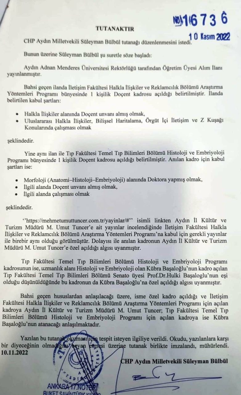 CHP Aydın Milletvekili Süleyman Bülbül, geçen eylül ayında Adnan Menderes Üniversitesi’nin ilan edilen iki akademisyen kadrosunun hangi isimler için açıldığını noterde tutanak altına aldı. İsimlerden biri göreve başladıktan iki hafta sonra emekli oldu. İkinci isim ise 2023 seçimlerinde AKP’den milletvekili adayı oldu, seçilemedi, kendisi için hazır bekleyen kadroya atandı.