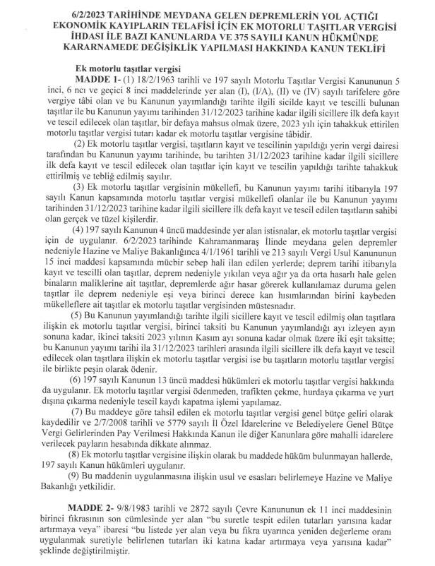 Buna göre motorlu taşıtlar vergisi 2023'te 2 defa daha alınacak. Teklife göre 31 Aralık 2023 tarihine kadar ilk defa kayıt ve tescil edilecek taşıtlar dahil olmak üzere bir defaya mahsus olmak üzere 2023 yılında tahakkuk ettirilen motorlu taşıtlar vergisi kadar ek motorlu taşıtlar vergisi alınması öngörülüyor.