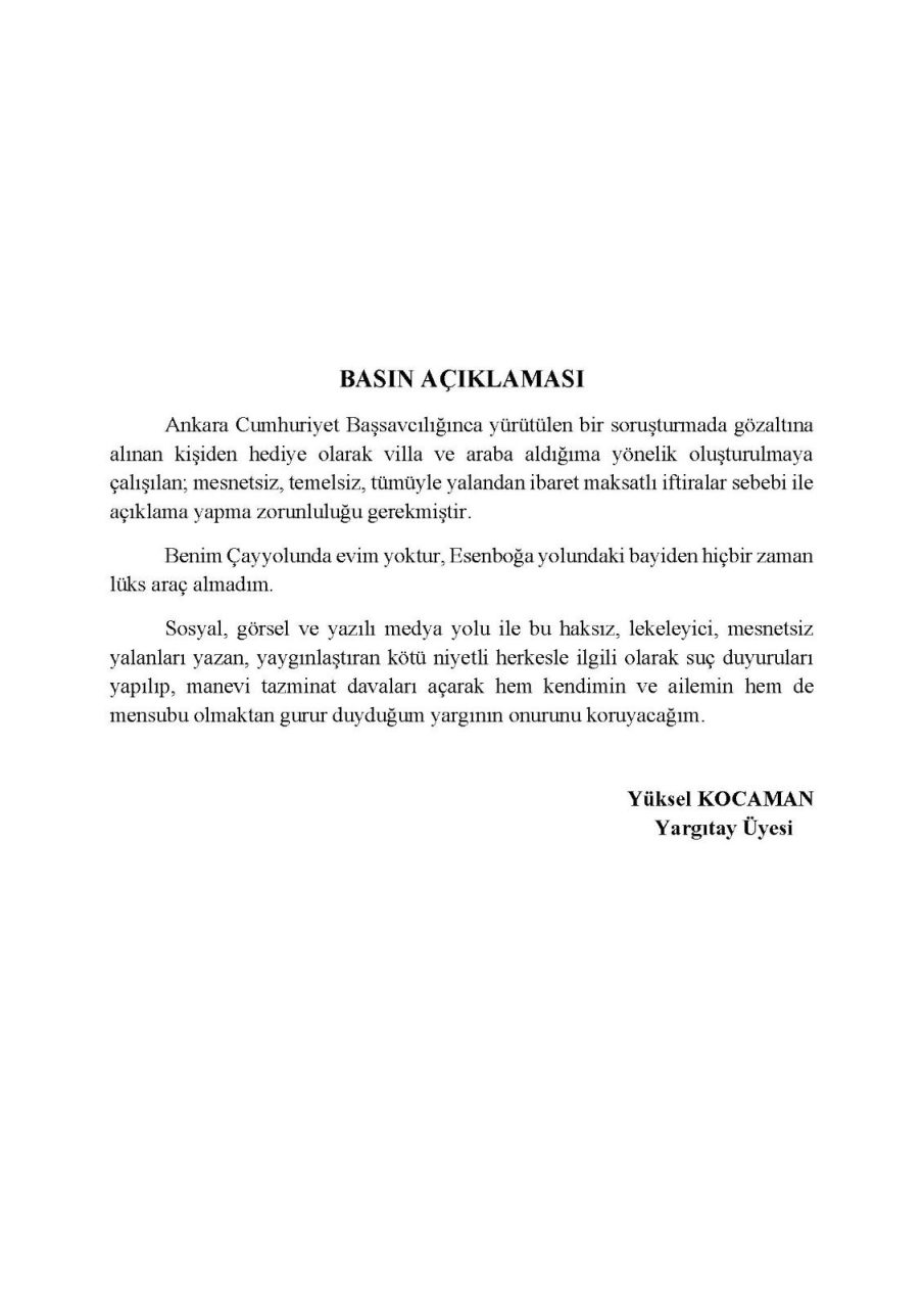 "Benim Çayyolunda evim yoktur, Esenboğa yolundaki bayiden hiçbir zaman lüks araç almadım. Sosyal, görsel ve yazılı medya yolu ile bu haksız, lekeleyici, mesnetsiz yalanları yaygınlaştıran kötü niyetli herkesle ilgili olarak suç duyuruları yapılıp, manevi tazminat davaları açarak hem kendimin ve ailemin hem de mensubu olmaktan gurur duyduğum yargının onurunu koruyacağım"