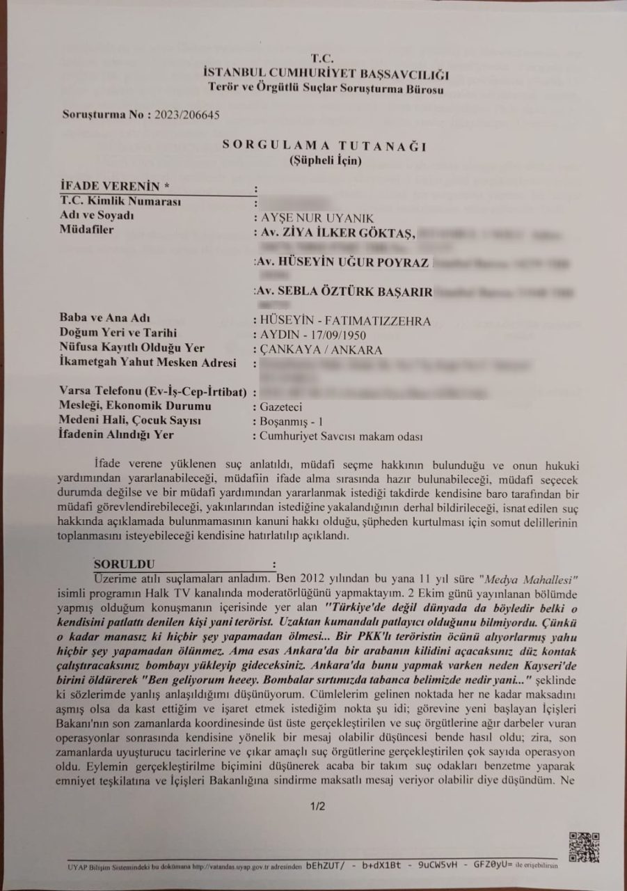 Halk TV'de program sırasında Ankara'daki bombalı eylem saldırısı girişimine ilişkin sarf ettiği sözler sebebiyle programı yayımdan kaldırılan ve hakkında soruşturma açılan Gazeteci Ayşenur Arslan, İstanbul Terörle Mücadele Şube Müdürlüğü ekiplerince Sarıyer’deki evinde gözaltına alındı. Polis eşliğinde Çağlayan'da bulunan İstanbul Adalet Sarayı'na getirilen Arslan, savcılık ifadesinin ardından serbest bırakıldı.