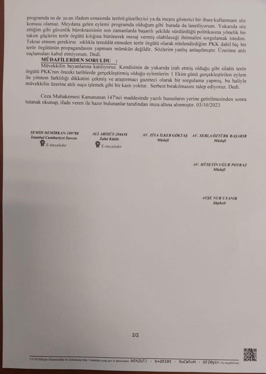 "Sözlerimde yanlış anlaşıldığımı düşünüyorum. Cümlelerim gelinen noktada her ne kadar maksadını aşmış olsa da kast ettiğim ve işaret etmek istediğim nokta şu idi; görevine yeni başlayan İçişleri Bakanı'nın son zamanlarda koordinesinde üst üste gerçekleştirilen ve suç örgütlerine ağır darbeler vuran operasyonlar sonrasında kendisine yönelik bir mesaj olabilir düşüncesi bende hasıl oldu; zira, son zamanlarda uyuşturucu tacirlerine ve çıkar amaçlı suç örgütlerine gerçekleştirilen çok sayıda operasyon oldu. Eylemin gerçekleştirilme biçimini düşünerek acaba bir takım suç odakları benzetme yaparak emniyet teşkilatına ve İçişleri Bakanlığına sindirme maksatlı mesaj veriyor olabilir diye düşündüm. Ne programda ne de şu an ifadem esnasında terörü güzelleyici ya da meşru gösterici bir ibare kullanmam söz konusu olamaz. Meydana gelen eylemi programda olduğum gibi burada da lanetliyorum. Yukarıda söz ettiğim gibi güvenlik bürokrasisinin son zamanlarda başarılı şekilde sürdürdüğü politikasına yönelik bir takım güçlerin terör örgütü kılığına bürünerek mesaj vermiş olabileceği ihtimalini sorgulamak istedim. Tekrar etmem gerekirse sıklıkla tereddüt etmeden terör örgütü olarak nitelendirdiğim PKK dahil hiç bir terör örgütünün propagandasını yapmam mümkün değildir. Sözlerim yanlış anlaşılmıştır. Üzerime atılı suçlamaları kabul etmiyorum.."
