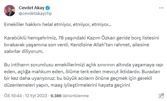 CHP Karabük Milletvekili Cevdet Akay, 78 yaşındaki bir Karabüklü hemşerisinin geride borç bırakarak hayatına son verdiğin duyurdu. Akay "Bu intiharın sorumlusu emeklilerimizi açlık sınırının altında yaşamaya razı eden, açlığa mahkum eden, ölüme terk eden mevcut iktidardır. Buradan bir kez daha uyarıyoruz: bu büyük acıların önüne geçmek için gerekli düzenlemeleri yapın, maaş iyileştirmelerini hayata geçirin" dedi.