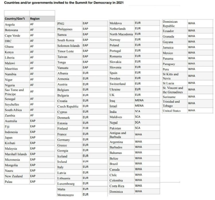 Politico'nun elde ettiği ve 107 ülkenin bulunduğu belgeye göre; ABD'nin NATO müttefiklerinden olan Türkiye ve Macaristan zirveye davet edilmedi. Listede Angola, Gana gibi ülkeler yer alırken, Türkiye ve Macaristan'ın yanı sıra İran, Rusya, Çin ve Afganistan gibi ülkeler de bulunmuyor. Politico'ya göre liste üzerinde çalışmalar henüz sonlanmış değil ve davetli listesi değişebilir.