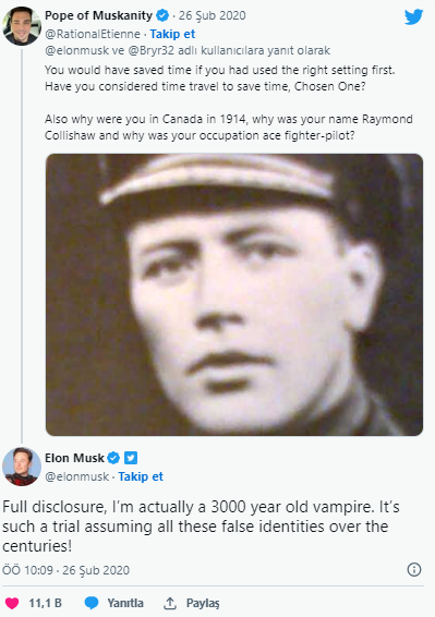 Sık sık "zaman yolcusu" teorisine maruz kalan Musk, sosyal medyada “1914'te neden Kanada'daydın, adın neden Raymond Collishaw'dı ve neden üst düzey savaş pilotuydun?” diye soran bir takipçisine, "Açıklıyorum, ben aslında 3 bin yaşında bir vampirim. Yüzyıllar boyunca tüm o sahte kimliklere bürünen bir mahluk!" diyerek yanıt vermişti.