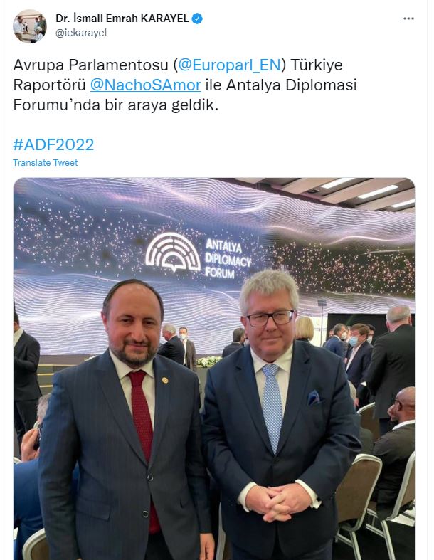 Karayel, Czarnecki ile çekilmiş fotoğrafını, "Avrupa Parlamentosu Türkiye Raportörü Nacho Sanchez Amor ile Antalya Diplomasi Forumu'nda bir araya geldik" ifadeleriyle paylaştı. Amor, Karayel'in paylaşımına, "Bu ben değilim, özür dilerim. Bu benim meslektaşım Czarnecki" diye cevap verdi. Karayel, paylaşımı birkaç dakika sonra sildi.