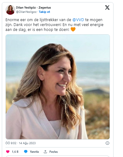 Muhafazakar VVD partisinin resmi X (eski adıyla Twitter) hesabından konuya ilişkin yapılan açıklamada da "Dilan Yeşilgöz resmi olarak yeni liderimiz" ifadelerine yer verildi.
