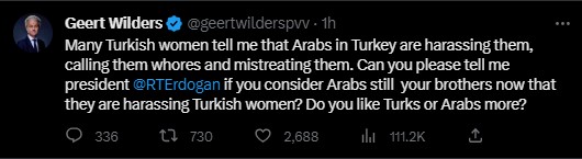 Wilders Erdoğan’ı Twitter'dan etiketleyerek “Birçok Türk kadını bana, Türkiye'deki Arapların kendilerini taciz ettiğini, onlara fahişe dediğini söylüyor. Türk kadınlarını taciz eden Arapları hala kardeşiniz olarak görüyor musunuz? Türkleri mi yoksa Arapları mı daha çok seviyorsunuz?” diye sordu.