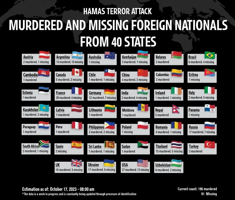 İsrail Hamas'ın öldürdüğü ya da rehin aldığı kişilerin arasında 40 ülkenin vatandaşının olduğunu ifade etti. İsrail hükümetinden yapılan açıklamaya göre öldürülen Türk vatandaşı sayısı ise üç. İsrail'in açıkladığı verilere köre kayıp Türk vatandaşı bulunmuyor.