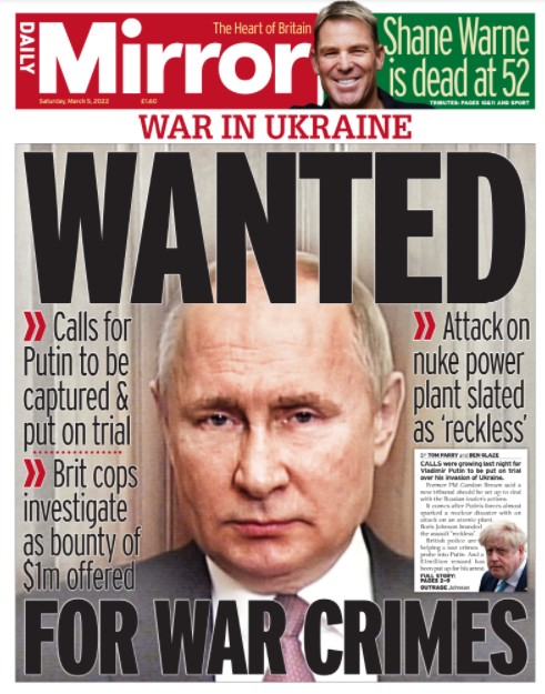 Facebook, Twitter, Youtube, CNN, Bloomberg News, BBC gibi haber ve sosyal medya platformları yasaklandı. İngiliz medyası Putin'e karşı sert manşetlerle çıktı. İngiliz Daily Mirror gazetesi dün birinci sayfasında, Putin’in fotoğrafını kullanarak, "Savaş suçlarından aranıyor" manşetini attı. BBC Genel Müdürü Tim Davie, "Yeni yasal düzenleme bağımsız gazeteciliği suç haline getiriyor. Bu yüzden gazetecilerimiz ve çalışanlarımızın güvenliği için şimdilik işlerini askıya aldık" dedi.