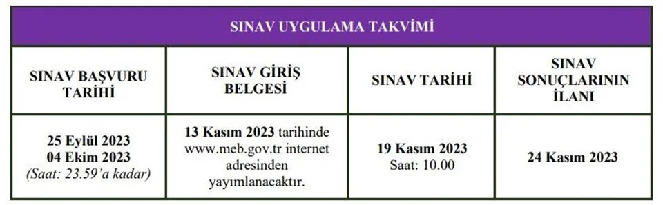 Adayların fotoğraflı sınav giriş belgesi, 13 Kasım 2023'te "http://www.meb.gov.tr" internet adresinden yayımlanacak.