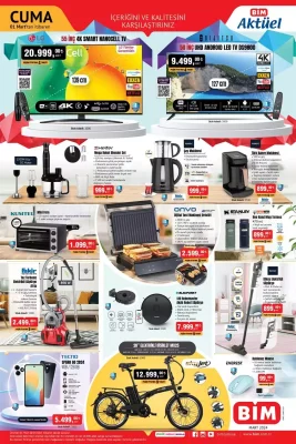 BİM'in yeni aktüel kataloğu 1 Mart 2024 tarihinde raflardaki yerini aldı. Bu hafta BİM'e gelecek ürünler, alışveriş tutkunları tarafından heyecanla bekleniyor. Bugün başlayacak olan indirimlerde, dikey süpürgeden robot süpürgelere, çay makinelerinden Türk kahve makinelerine kadar birçok ürün, BİM online platformu bim.com.tr üzerinden ve marketlerde bulunabilecek. 1 Mart 2024 tarihli BİM aktüel kataloğunda şu ürünler yer alacak: Dijitsu 50' UHD Android Led TV 9.499 TL, Heifer Mega Robot Blender Seti 999 TL, Range Çay Makinesi 999 TL, LG 55" 4K Akıllı Nanocell TV 20.999 TL, Range Türk Kahve Makinesi 899 TL. Peki, bim'de bu hafta neler var? İşte, BİM'in 1 Mart 2024 tarihli aktüel ürünler kataloğu.