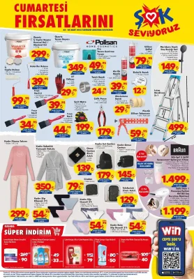 Şok 2 Mart 2024 kataloglarında hafta sonu indirimleri ev ekonomisine katkı sağlayacak detaylarla dolu olarak geliyor. Şok Aktüel kataloglarında bulunan yeni indirimlerde öncelikle Polisan markalı boyalar bulunacak. Bu ürünlerde iç cephe boyası kumsal beji/ marjinal gri 10 kg 299 liradan satılacak. Tavan boyası 17,5 kg olarak 349 liradan sizlerle buluşacak. İç cephe rulosu 99,95 liradan ve kalorifer rulosu 39,95 liradan satılacak. Fırça çeşitlerinde 2 nolu fırça 34,95TL, 2,5 nolu fırça 39,95 TL ve 3 nolu fırça 44,95 TL olarak sizleri bekleyecek. Haftanın bir diğer ürünü de tamir bandı 24,95TL akrilik mastik 39,95 tl ve silikon şeffaf 79,95 TL fiyata sahip olarak sizleri bekleyecek. Pro tavan kestirme fırçası 49,95TL adet fiyatıyla satılacak olup çelik pense de 179 TL fiyat ve şerit metrede 199 TL fiyat sizlerle olacak. Plastik silikon tabancası 59,95 tl fiyatıyla öne çıkarken elektrik bandı 12,95 liradan satılacak. Şok 2 Mart 2024 kataloglarında meridyen siyah duş başlığı seti 149 TL fiyatıyla uzaklara gelecek olup luiza 3 + 1 merdiven 499 liradan müşterisini bekleyecek. Bu tamirat tadilat ve boya ürünlerinin yanı sıra haftaya damga vuran ikinci ürün grubu tekstil kategorisinde fırsatlar sunacak. Ayrıca kurutma makinesi ve epilasyon cihazı Braun markalı olarak satılacak. Şok Aktüel indirimli ürünlerinde kadın pijama takımı 299 liradan, kadın sabahlık yumuşak dokulu 350 liradan, iç çamaşırları uygun fiyatla sizlerle buluşacak. Omuz çantası zincir askılı 139 TL, kadın sırt çantası 179 TL ve kadın omuz çantası 145 TL fiyatta satılacak olup cüzdan 79,95 liradan, telefonluk zincirli askılı yalnızca 129 liradan raflara gelecek. Şok Hafta Sonu kataloğunda Braun silk epil 5 5620 sensomart epilasyon cihazı ıslak ve kuru kullanıma uygun olarak 1.499 liradan ve satin hair 1 powerperfection hd180 saç kurutma makinesi 2 yıl garantili olarak 1.199 liradan market raflarında sizleri bekleyecek. Son bölümde kasada süper indirimler sunan ve 25 tl üzeri alışverişlerde geçerli olan kampanyalar yer alacak. Bu kampanyalar içerisinde kırışıklık karşıtı 100 kremi bulaşık deterjanı ketçap ve mayonez, çamaşır suyu ve diş macunu bulunacak.