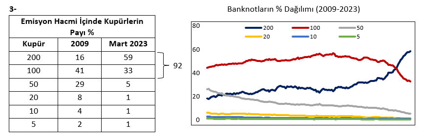 Uluslararası kabuller en büyük kupürlü banknotun emisyon içindeki payının %50’yi geçtiği taktirde daha büyük bir banknot çıkarılması gerektiğini göstermektedir. Şu an itibariyle en büyük banknot olan 200 TL’nin emisyon içindeki payı % 59’u geçmiştir.