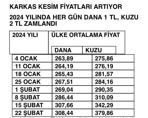 Karkas kesim fiyatları artıyor 2024 yılında her gün dana 1 TL, kuzu 2 TL zamlandı