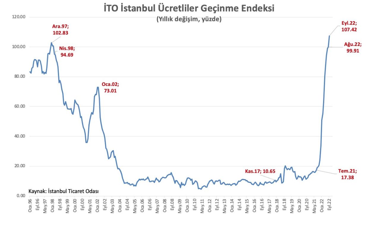 İstanbul Ticaret Odası (İTO) verilerine göre kentteki tüketici fiyatları geçen yıla göre yüzde 107,42 arttı.