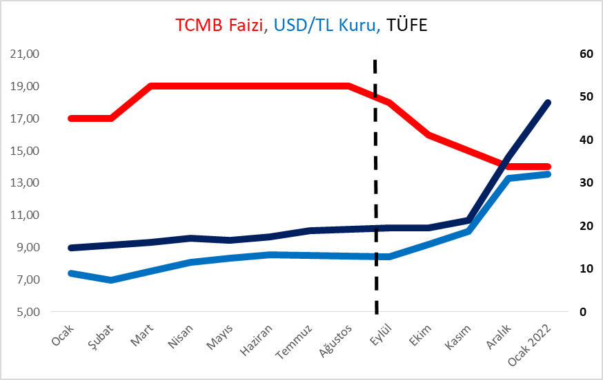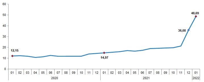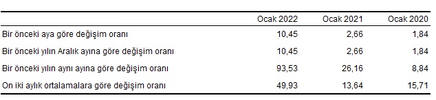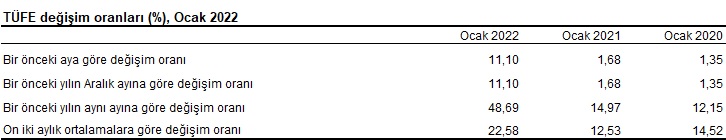 Yurt İçi Üretici Fiyat Endeksi (Yİ-ÜFE) 2022 yılı Ocak ayında bir önceki aya göre %10,45 bir önceki yılın Aralık ayına göre %10,45, bir önceki yılın aynı ayına göre %93,53 ve on iki aylık ortalamalara göre %49,93 artış gösterdi. Sanayinin dört sektörünün yıllık değişimleri; madencilik ve taş ocakçılığında %86,51, imalatta %90,29, elektrik, gaz üretimi ve dağıtımında %138,48, su temininde %25,88 artış olarak gerçekleşti. Ana sanayi gruplarının yıllık değişimleri; ara malında %106,40, dayanıklı tüketim malında %58,49, dayanıksız tüketim malında %65,25, enerjide %142,06 artış olarak gerçekleşti. Yıllık en düşük artış; %25,88 ile su ve suyun arıtılması ve dağıtılması, %28,08 ile temel eczacılık ürünleri ve müstahzarlarında gerçekleşti. Kok ve petrol ürünleri %180,75, ham petrol ve doğalgaz %162,84, elektrik, gaz, buhar ve iklimlendirme %138,48 ile en fazla artış olan sektörler.