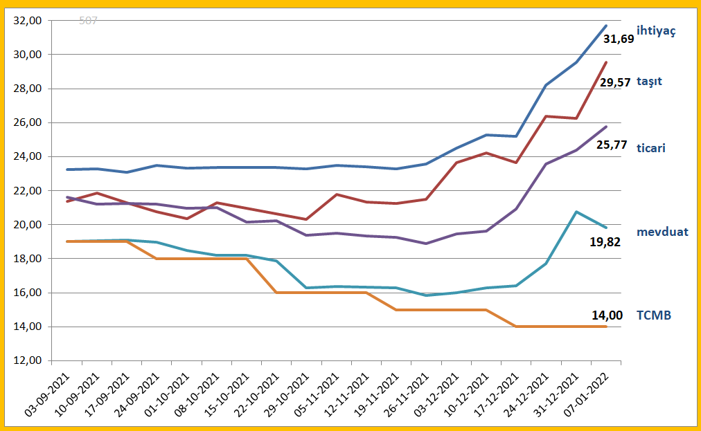 “Piyasadaki #fiili faizler, haftalık güncelleme: Bireysel kredi faizleri 2-3’er puan artarak %30’un üstüne, mevduat ise %20’nin altına gidiyor. Yeni yılda beklenen sakinleşmeden eser yok, marjlar iyice açılıyor.”