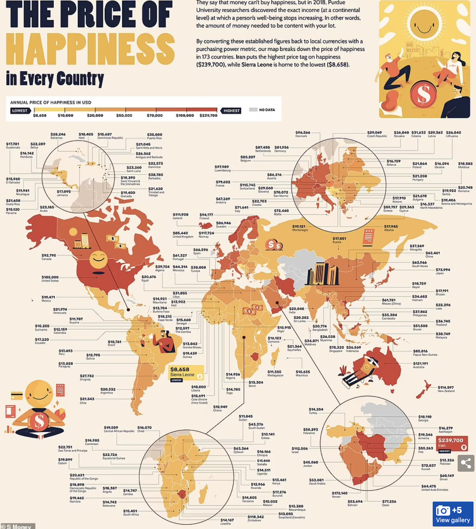 S.Money' şirketi tarafından dünya çapında 174 ülkeyi inceleyen yeni bir araştırma, bir kişinin mutlu olmak için her yıl ihtiyaç duyduğu minimum para miktarını ortaya çıkardı.Onedio'dan Burak Boyoglu'nun araştırmadan aktardığı...