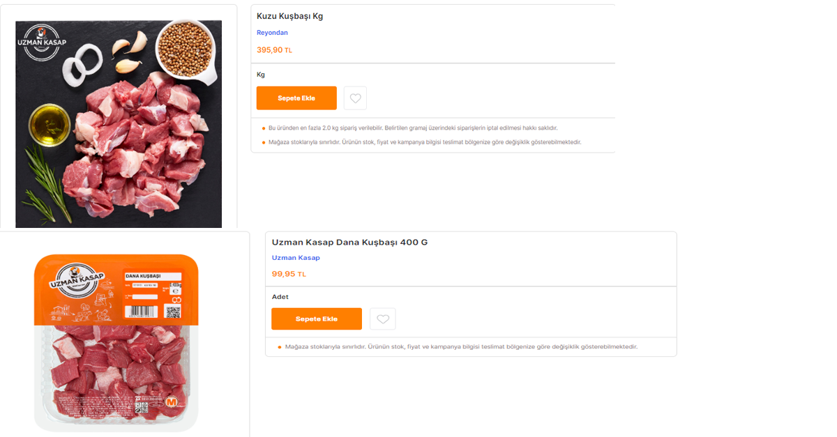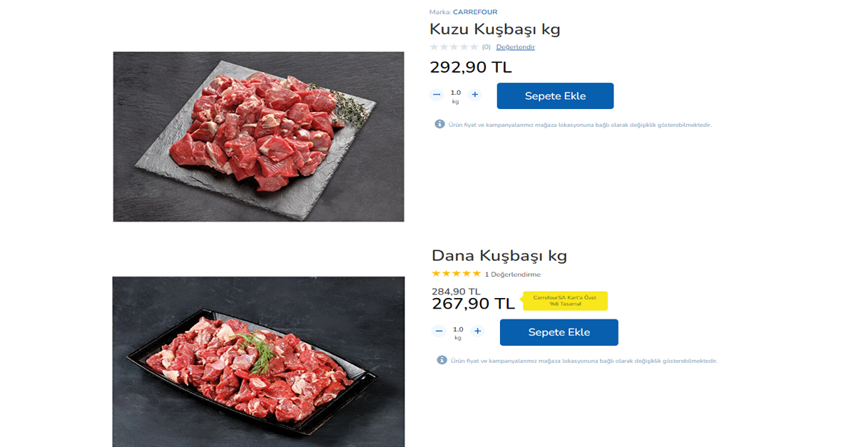 CarrfourSA’da satılan bir kilogramlık kuzu kuşbaşı etin kilosu 292,90 TL iken dana kuşbaşının fiyatı ise 267,90 kuruş. Dana eti 25 TL daha ucuz.
