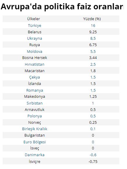 Avrupa ülkelerine bakıldığındaysa Türkiye, yüzde 16 ile faiz oranının en yüksek olduğu ülke konumunda. Diğer Avrupa ülkelerinden Belarus 9.25 ile ikinci, Ukrayna 8.25 ile üçüncü sırada.