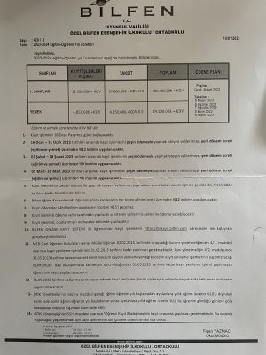 Bilfen 1. Sınıf ücretlerini açıkladı: yemek dahil 640 bin TL, aşağıda fotolarını koydum, geçen sene o günkü kur ile 13.500 USD, bugün ise 21.300 USD. Bir senede dolar bazında %58 zammın izahı yok.
