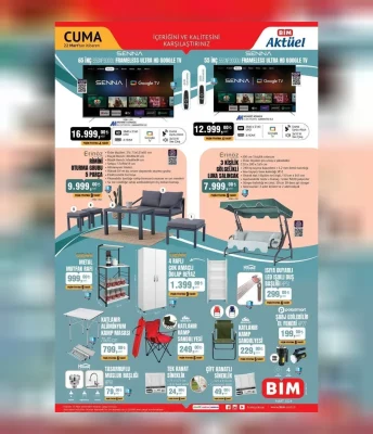 Senna markasının 65 inç Frameless Ultra HD Google Televizyonu 16.999 TL, 55 inçlik modeli ise 12.999 TL fiyat etiketiyle BİM’de satışa sunuluyor. Erinöz’ün Rimini serisi 5 parçalık oturma grubu 9.999 TL, Luka modeli 3 kişilik gölgelikli salıncak ise 7.999 TL. Mutfaklar için metal raf 999 TL, çok amaçlı 4 raflı beyaz dolap 1.399 TL. Banyolar için ısıya dayanıklı led ışıklı duş başlığı 299 TL, açık hava etkinlikleri için katlanır alüminyum kamp masası 799 TL ve katlanır kamp sandalyesi 249 TL. Ayrıca, şarj edilebilir el feneri 199 TL fiyatıyla dikkat çekiyor.