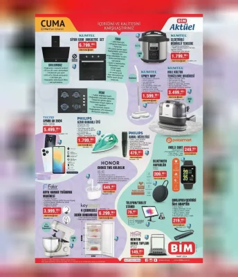 Kumtel markasının ev aletleri koleksiyonu, Halı ve Koltuk Temizleme Makinesi için 3.499 TL, şık Siyah Cam Ankastre Set için 6.799 TL, pratik Elektrikli Düdüklü Tencere için 1.799 TL ve kullanışlı Sprey Mop için 1.599 TL fiyat etiketiyle BİM mağazalarında yer alıyor. Ayrıca, Tecno’nun yeni modeli Spark Go 2024 Cep Telefonu 5.499 TL, Philips’in Azur Buharlı Ütüsü 1.799 TL, Sakal Düzeltici ise sadece 479 TL. Teknoloji severler için Polosmart Akıllı Saat 249 TL, Bluetooth Hoparlör 209 TL, ve Honor Choice X5 Lite Tws Kulaklık 649 TL gibi cazip fiyatlarla sunuluyor. Aksesuarlar arasında Telefon / Tablet Standı 79 TL, Çoklayıcı / Çevirici 5 in 1 Adaptör 219 TL ve Fakir Arya Hamur Yoğurma Makinesi 3.999 TL ile Keysmart 4 Çekmeceli Derin Dondurucu 6.299 TL gibi ürünler de bulunuyor.