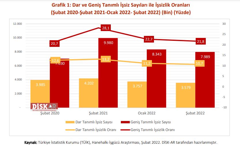 DİSK-AR da nisan ayı İşsizlik ve İstihdamın Görünümü Raporu’nu yayımlandı. DİSK-AR’ın hesaplamasına göre mevsim etkisinden arındırılmış geniş tanımlı işsiz sayısı Şubat 2022’de 7 milyon 989 bin kişi olarak gerçekleşti. Pandemi öncesine göre işsiz sayısı 959 bin arttı.