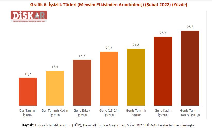 Cinsiyete göre işsizlik oranlarında kadın işsizliği tüm işsizlik türlerinde en yüksek kategori olarak görülmeye devam ediyor. Mevsim etkisinden arındırılmış dar tanımlı işsizlik oranı erkeklerde yüzde 9,3 iken kadınlarda yüzde 13,4’ya yükseldi. Geniş tanımlı işsizlik (âtıl işgücü) ise erkeklerde yüzde 18, kadınlarda ise yaklaşık yüzde 30’dur. Geniş tanımlı kadın işsizliği ile geniş tanımlı erkek işsizliği arasındaki fark 10,8 puandır.