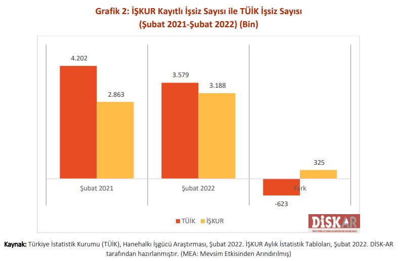 İŞKUR Mart 2022 verilerine göre kayıtlı işsiz sayısının 3 milyon 635’e yükselmesiyle Mart 2022’nin kayıtlı işsiz sayısı, Şubat 2022’nin ankete dayalı işsiz sayısının (3 milyon 579 bin) üzerine çıktı.