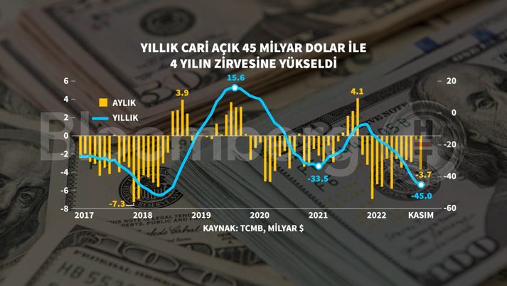 TCMB verilerine göre 12 aylık cari açık ise 45 milyar dolarla Ağustos 2018'den bu yana en yüksek seviyeye ulaştı. Ekim ayında cari denge turizm verilerindeki revizyonun etkisiyle 0,35 milyar dolarla yılın en düşük açığını vermişti. Kasım ayında dış ticaret dengesi 8,8 milyar dolar açık vermişti. TCMB verilerine göre Kasım'da altın ve enerji hariç cari denge 5,3 milyar dolar fazla verdi. Hizmetler dengesi kaynaklı girişler 3,68 milyar dolar seviyesinde gerçekleşti. Bu kalem altında seyahat kaleminden kaynaklanan net gelirler 2,65 milyar dolar oldu.