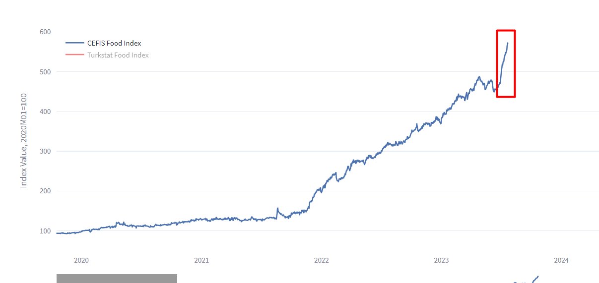 İnternet ortamında 5 zincir perakendeciden aldığı fiyatları, TÜİK metodolojisine uygun olarak yayımlayan CEFIS verilerine göre Türkiye'deki gıda fiyatlarında artış oranı 19 Haziran-23 Temmuz arasında yüzde 25 olarak kaydedildi. TÜİK'in açıkladığı haziran ayına ilişkin son gıda enflasyonu verisi ise yıllık bazda yüzde 53,92 olarak ilan edildi.