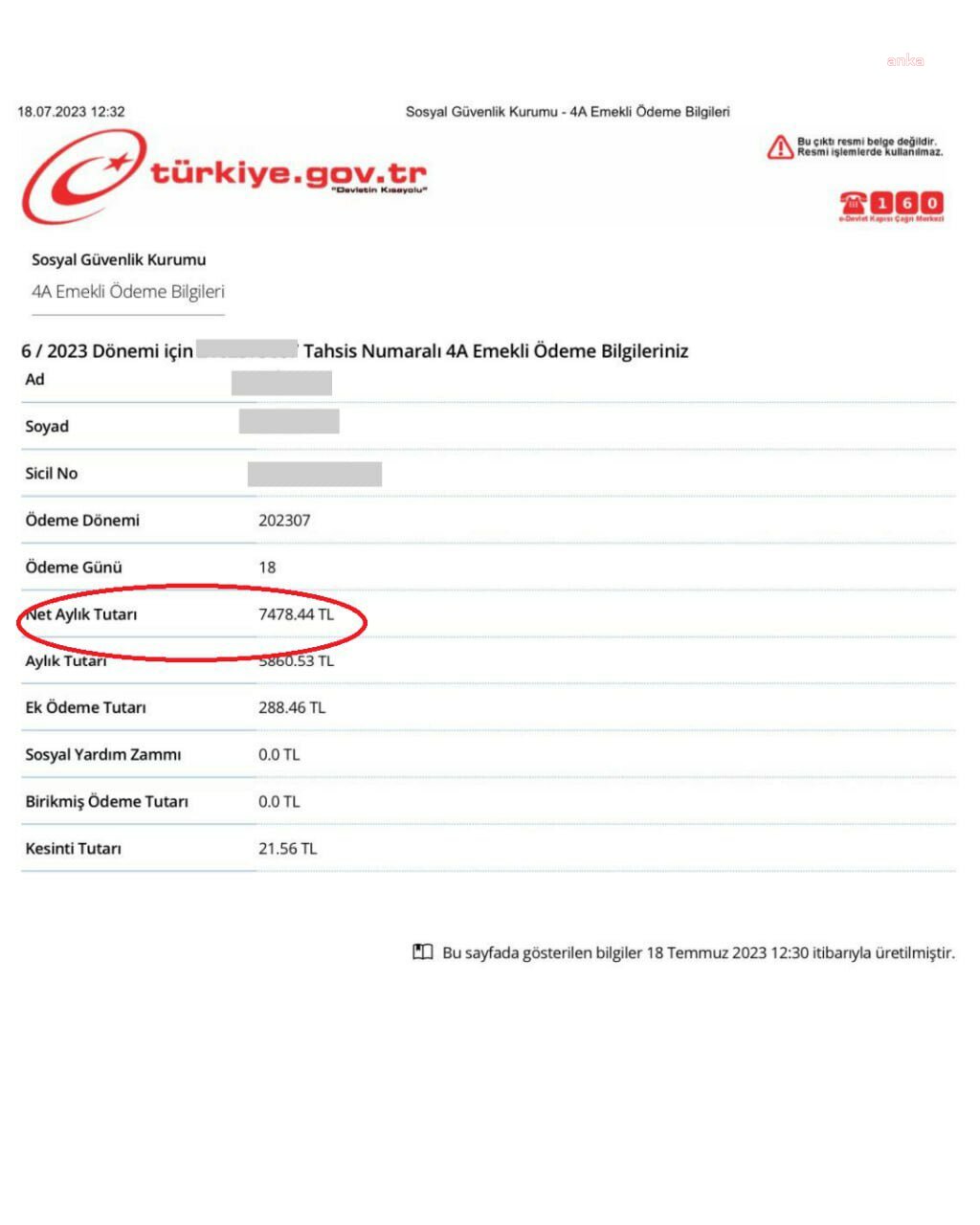 "Emeklilere oynanan zam oyunu! Kök aylığa uygulanan yüzde 25 zam, emeklinin eline geçmedi. Çoğu emeklinin zamlı maaşı 7 bin 500’ün altında kaldı. 'Şanslı' bir emekli, bu ay 7 bin 618 lira maaşı yatmış, 118 lira zam almış. Emekli, bu zamla bir kalıp peynir bile alamaz."