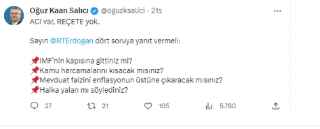 CHP İstanbul Milletvekili ve Parti Meclisi Üyesi Oğuz Kaan Salıcı, "Acı var, reçete yok. Sayın Erdoğan dört soruya yanıt vermeli: IMF’nin kapısına gittiniz mi? Kamu harcamalarını kısacak mısınız? Mevduat faizini enflasyonun üstüne çıkaracak mısınız? Halka yalan mı söylediniz” dedi.