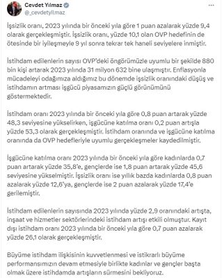 Yılmaz, "İstihdam oranında ve işgücüne katılma oranında da OVP hedefleriyle uyumlu gerçekleşmeler kaydedilmiştir. İşgücüne katılma oranı 2023 yılında bir önceki yıla göre kadınlarda 0,7 puan artarak yüzde 35,8’e, gençlerde ise 1,8 puan artarak yüzde 45,6 seviyesine yükselmiştir. İşsizlik oranı ise yıllık bazda kadınlarda 0,8 puan azalarak yüzde 12,6’ya, gençlerde ise 2 puan azalarak yüzde 17,4’e gerilemiştir. İstihdam edilenlerin sayısında 2023 yılında yüzde 2,9 oranındaki artışta, inşaat ve hizmetler sektörlerindeki istihdam artışı etkili olmuştur. Kayıt dışı istihdam oranı 2023 yılında bir önceki yıla göre 0,7 puan azalarak yüzde 26,1 olarak gerçekleşmiştir. Büyüme istihdam ilişkisinin kuvvetlenmesi ve istikrarlı büyüme performansımızın devam etmesiyle birlikte kadınlar ve gençler başta olmak üzere istihdamda artışların sürmesini bekliyoruz" değerlendirmesinde bulundu.