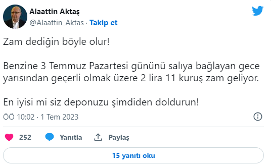 Aktaş, salı gününden itibaren benzine 2 lira 11 kuruş zam geleceğini duyurdu. Haberi sosyal medya hesabından duyuran Aktaş, şu paylaşımı kaydetti:
