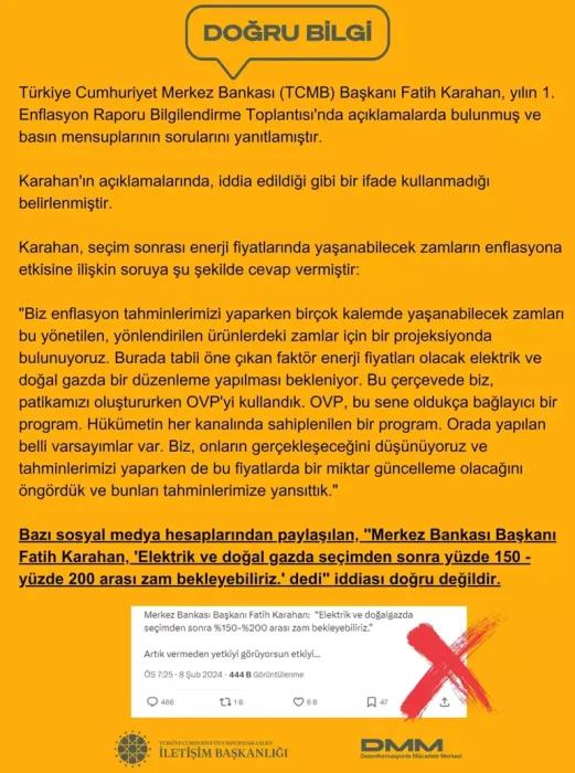 Dezenformasyonla Mücadele Merkezi, Merkez Bankası Başkanı Fatih Karahan'ın "Elektrik ve doğal gazda seçimden sonra yüzde 150- 200 arası zam bekleyebiliriz" dediğine ilişkin iddiaları yalanladı.