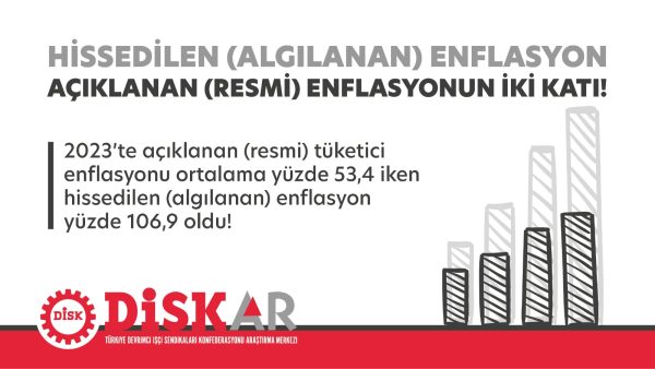 DİSK-AR, 2023’te açıklanan (resmi) tüketici enflasyonu ortalama yüzde 53,4 iken hissedilen (algılanan) enflasyon yüzde 106,9 olarak açıkladı.