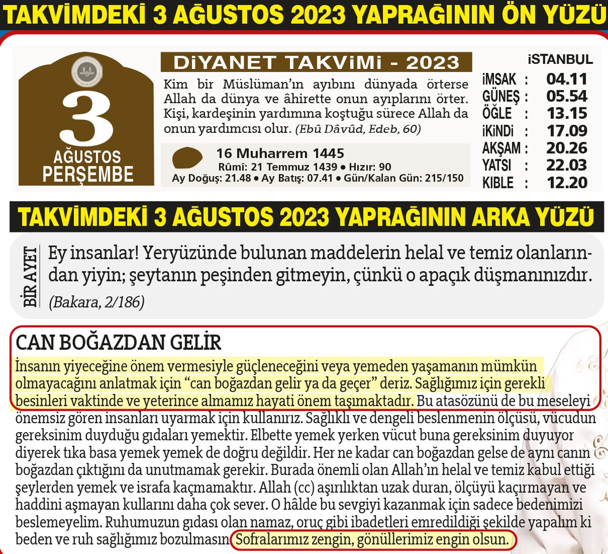 Sözcü'den Deniz Ayhan'ın haberine göre 36 milyar liralık dev bütçesiyle sürekli tartışılan Diyanet'ten, ekonomik krizle mücadele eden vatandaşa ilginç bir tavsiye geldi. Diyanet'in takviminin 3 Ağustos 2023 tarihli sayfasında, Bakara Suresi ve “Can boğazdan gelir” sloganı yer aldı. Takvimde vatandaşa şu öneriler yapıldı: