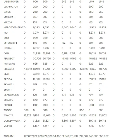 Citroen, 10 bin 71 satışla dördüncü ve Volkswagen 8 bin 397 satışla beşinci oldu.