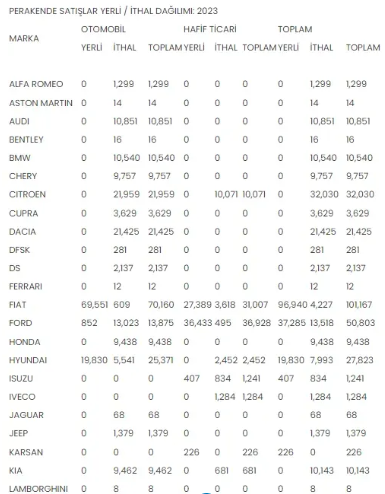 En çok satılan otomobil ve hafif ticari araç markaları belli oldu