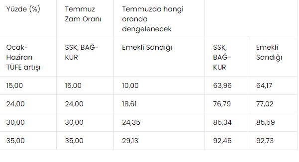 Bu durumda, örneğin ocak – haziran döneminde enflasyon yüzde 15 olursa SSK ve BAĞ-KUR aylıkları temmuz ayında yüzde 15 oranında artacak. Emekli memurlar açısından enflasyon farkı olmayacak ve sadece yılın ikinci yarısına ilişkin yüzde 10’luk toplu sözleşme zammı alacaklar.