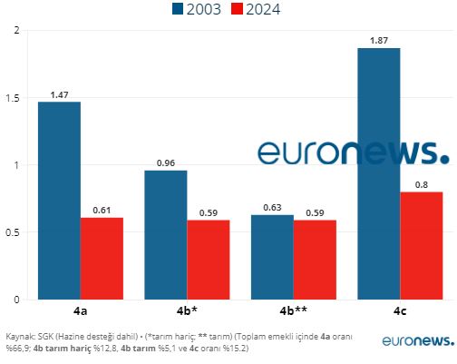 Aynı dönemde tarım hariç Bağ-Kur en düşük emekli maaşının (4b) asgari ücrete oranı 0.96’dan 0.59’a geriledi. Bağ-Kur tarım en düşük emekli maaşının asgari ücrete oranı ise 2003-2024 arasında 0.63’ten 0.59’a geriledi. Aslında Bağ-Kur oranları daha düşük ancak Hazine desteğiyle en düşük maaşlar 10 bin liraya tamamlandığı için yükseliyor.